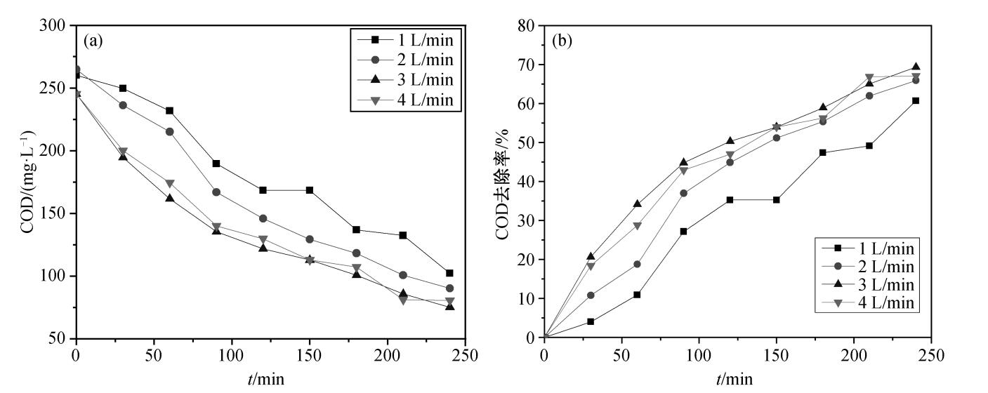 在催化劑投加量為 30%, 初始 pH 為 7 的條件下, 設(shè)置臭氧氣體流量分別為 1, 2, 3和 4 L/min, 探討臭氧氣體流量對(duì)催化臭氧化降解效果的影響, 實(shí)驗(yàn)結(jié)果如圖 所示。
