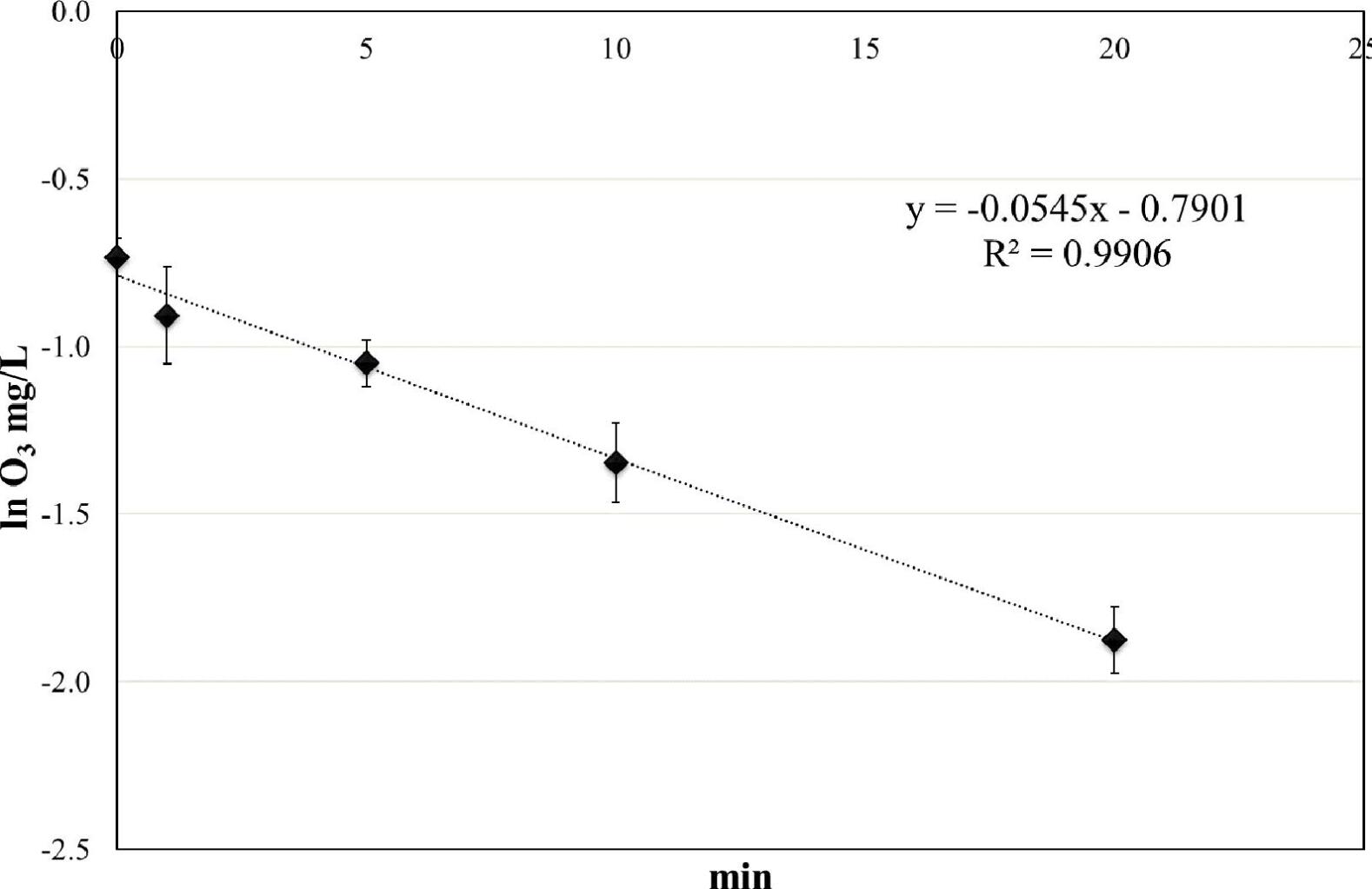 室溫 (RT) 下自來水中的臭氧衰減