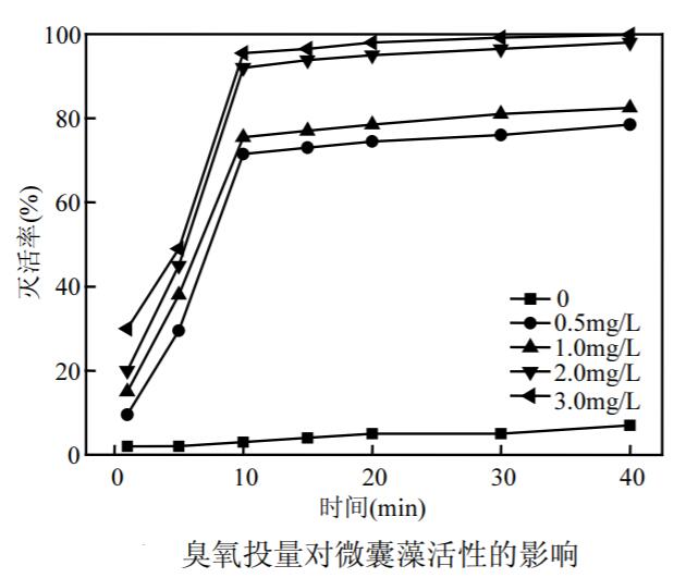 1.臭氧滅活銅綠微囊藻與其濃度和作用時間都有關(guān)系,隨著臭氧濃度和作用時間的延長,藻滅活率明顯增加, 很高去除率達到 99.0%(初始藻細胞密度 1.0×107個/L,臭氧濃度 2.0mg/L,作用時間40min,濁度為 1.0 NTU,溫度 25℃, pH 7.5).