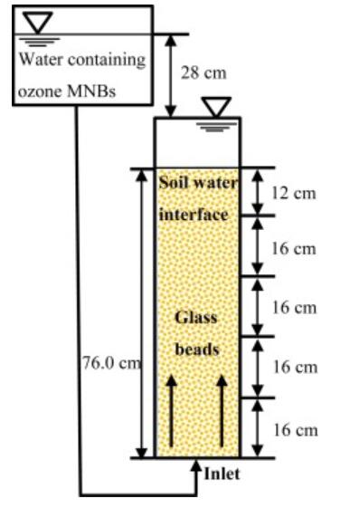 在內徑為12 cm 的有機玻璃圓筒(圖1)中進行了柱測試, 以研究臭氧MNB處理受有機物污染的地下水。將玻璃珠與甲基橙溶液以10 mg / L的初始濃度混合,以模擬被有機物污染的土壤和地下水。的比重的玻璃珠是2.43,平均直徑為60微米,干密度為1.43 克/厘米3 。的水力傳導率為1.3 × 10 -4米/秒,因為玻璃珠進行分級很差,其表示介質的沙子。土壤樣品的高度為76       分別在距底部16  厘米,32  厘米,48  厘米和64  厘米處分布有4個采樣口#1,#2,#3和#4 。去離子水中不斷產生臭氧MNB,以確保臭氧MNB的數量保持在峰值。含有臭氧的MNB的水從底部以0.368 的水力梯度i向上供入塔中。不使用MNB的去離子水用于對比測試。每個測試進行兩次以確保數據的可重復性。