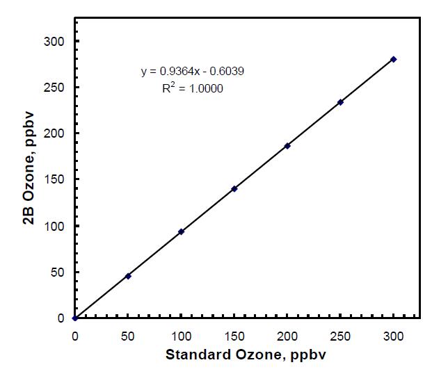 在本例中,校準參數 S 為 1/0.9364 = 1.068,四舍五入為 1.07。該圖的 y 截距,即方程 y = mx + b 中的 b,在上例中為 -0.6,應在臭氧校準源設置為零時測量的偏移的 ±2 ppb 范圍內。如果不是,則儀器可能存在問題。通常,這表明臭氧監測器流路中存在污染。