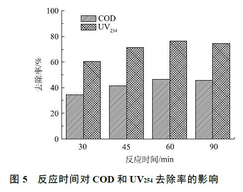 臭氧催化氧化實驗在室溫下進行,在廢水初始 pH 為 5,通過調(diào)節(jié)臭氧進氣濃度控制臭氧投加量為 300 mg·L−1 的條件下,考察了臭氧催化氧化時間對有機物去除效果的影響,結(jié)果如圖 5 所示。當反應時間從 30 min 增至 60 min 時,COD 和 UV254 的去除率分別從 34.6%、60.4% 升高到 46.4%、76.3%,有機物的去除率隨反應時間的延遲而增加。這是由于·OH 在水中的壽命很短 [22],大約 為 10−9 s,臭氧催化氧化中·OH 氧化反應實際發(fā)生在催化劑周圍,在傳質(zhì)不充分的反應條件下,部分·OH 在未知有機物發(fā)生反應之前就已經(jīng)被淬滅。當臭氧催化氧化時間縮短時,單位時間內(nèi)臭氧投加量加大,產(chǎn)生的·OH 增多,導致大量·OH 未參與反應就淬滅,從而導致有機物去除率下降。當反應時間到達一定的臨界點時,再延長反應時間,其去除率增加不再明顯,臭氧催化氧化反應從 60 min延長至 90 min 時,COD 和 UV254 的去除率基本不變。