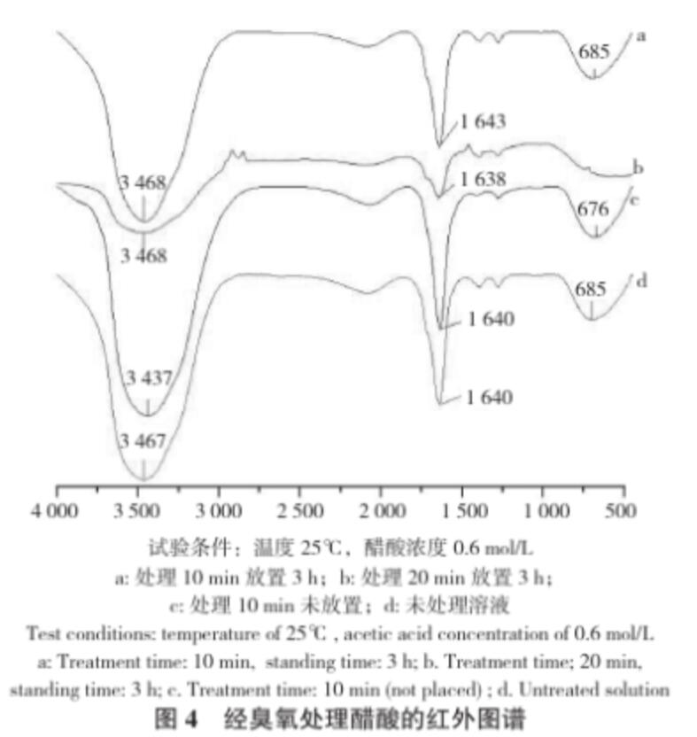 (4)配制4份濃度為0.6 mol/L的醋酸溶液,在25℃條件下,其中1份通入臭氧處理10 min之后放置3 h,1份通入臭氧20 min之后放置3 h,1份通入臭氧處理10 min未放置,1份不做處理,分別用紅外光譜分析醋酸的結構。