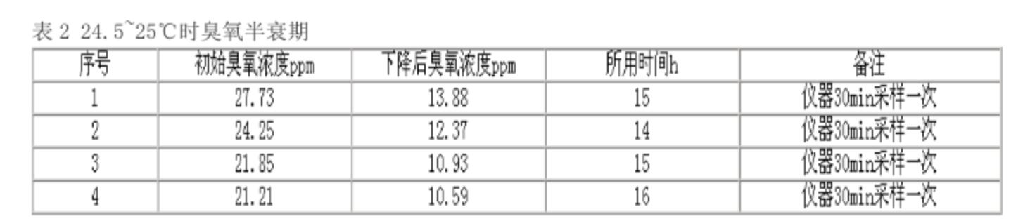 2000年6月,筆者曾在珠海觀察過臭氧濃度降低一半的時間,約為3h,當時的環境溫度為32~33℃。