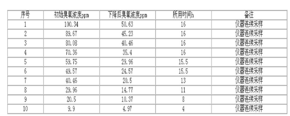 比利時臭氧專家W·J·馬舍蘭在《臭氧雨水的接觸和接觸器尾氣處理》文中認為:臭氧在霧中的半衰期約為4~5h。國內外一些臭氧資料中的半衰期相距很大。為此,我們用一容積為0.95mg/m3的玻璃柜,在環境溫度為20~25℃;環境溫度為60~80%Rh,臭氧濃度在200ppm以下的情況下做了一些實驗,現將結果抄錄如下。