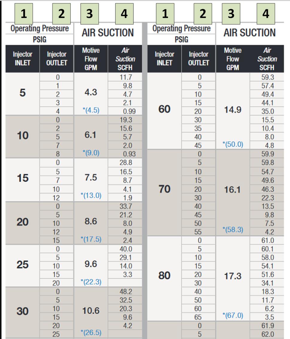 很后一欄稱(chēng)為空氣吸力,列出了在這些對(duì)齊的射流器入口/出口壓力下可以吸入水流的氣體(氧氣,臭氧,空氣)的數(shù)量。