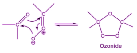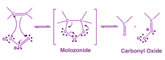 步驟1: 臭氧向碳-碳鍵的親電子加成形成了非常不穩(wěn)定的莫洛宗尼德中間體。 由于這種不穩(wěn)定的性質(zhì),莫洛宗尼德繼續(xù)反應-分解形成羰基分子和羰基氧化物分子,如下所示:
