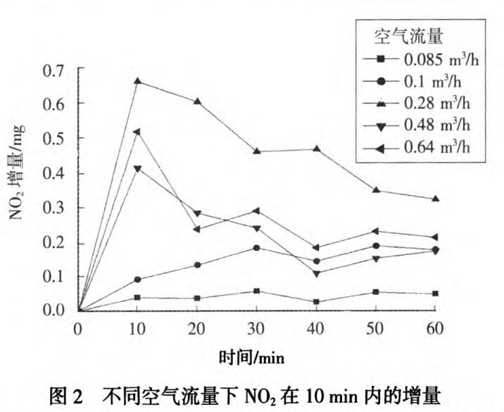 在1h的工作時間內NO2隨時間的增量與它的產量呈現-一定的正相關關系(見圖2),即NO2產量高,相應流量下的增量也維持在較高水平。起初的10 min內,NO2產量增幅較大,20min后增幅有所降低,且趨于平穩,很大值不超過0.5 mg/min,其余的值都在0.5 mg/min以下;空氣流量為0.48 m3/h時,增幅下降很多??梢娫摮粞醢l生器的副產物NO2隨時間的增量相對較穩定,且增幅不大。
