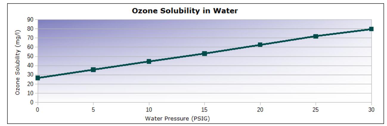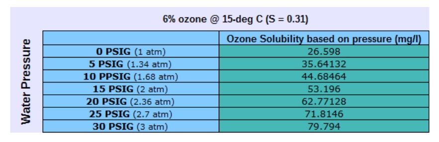 下面的圖表和表格說明了臭氧氣體在水中的溶解度,因為它與水的壓力有關。