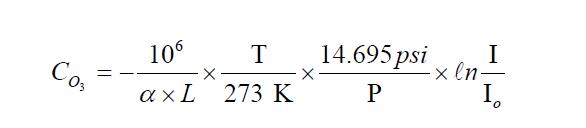 下面所示的Beer-Lambert方程,根據光強度的比值計算臭氧的濃度。