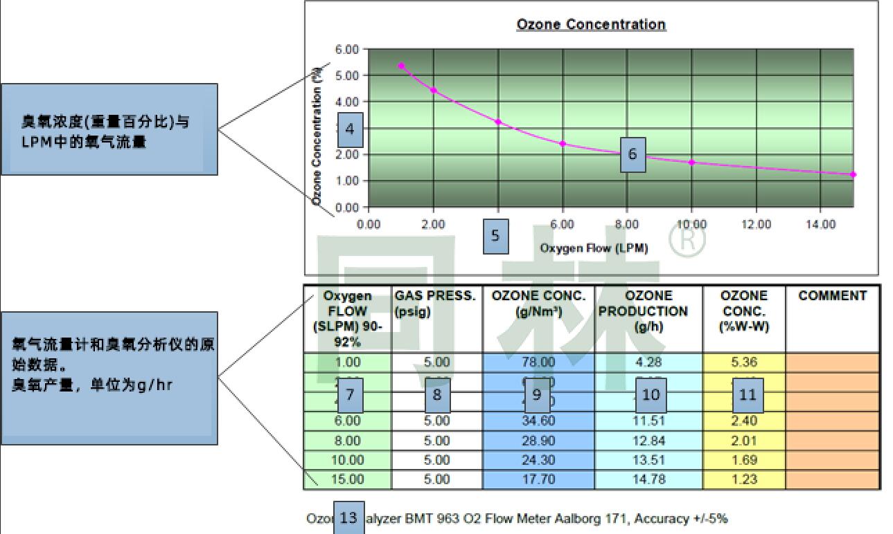 1. 臭氧產(chǎn)量顯示在垂直(Y軸)的圖形上,單位為克/小時或其他臭氧輸出測量單位