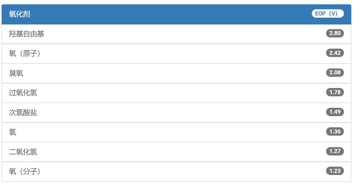 高級氧化工藝(AOP)結(jié)合了臭氧(O3)、紫外線(UV)、過氧化氫(H2O2))或催化劑提供強力水處理溶液,用于通過COD、BOD或TOC測量的殘余有機化合物的還原(去除)。所有AOP都設計用于產(chǎn)生羥基自由基,正是羥基自由基高效地破壞有機化合物。下圖顯示了羥基自由基與其他氧化劑的氧化能力。