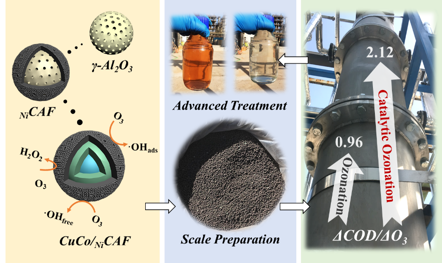 為解決此難題,張瀟源團隊在國家重點研發(fā)計劃項目、國家自然科學基金面上項目和環(huán)境模擬與污染控制國家重點聯(lián)合實驗室專項基金的經(jīng)費支持下,多年潛心研究,構建碳鋁復合載體金屬催化劑,開發(fā)了高效穩(wěn)定的臭氧催化劑制備和高級氧化技術,并開展長達120天的煤氣化實際廢水連續(xù)試驗,取得了良好的出水效果,出水指標遠優(yōu)于國家標準,相較傳統(tǒng)臭氧氧化提升120%的臭氧利用率(圖2),節(jié)約75%的運行能耗。該項研究解決了傳統(tǒng)臭氧高級氧化技術性能和穩(wěn)定性的問題,可為煤化工廢水和其他同類工業(yè)廢水的污染控制和回用提供了新的解決思路。